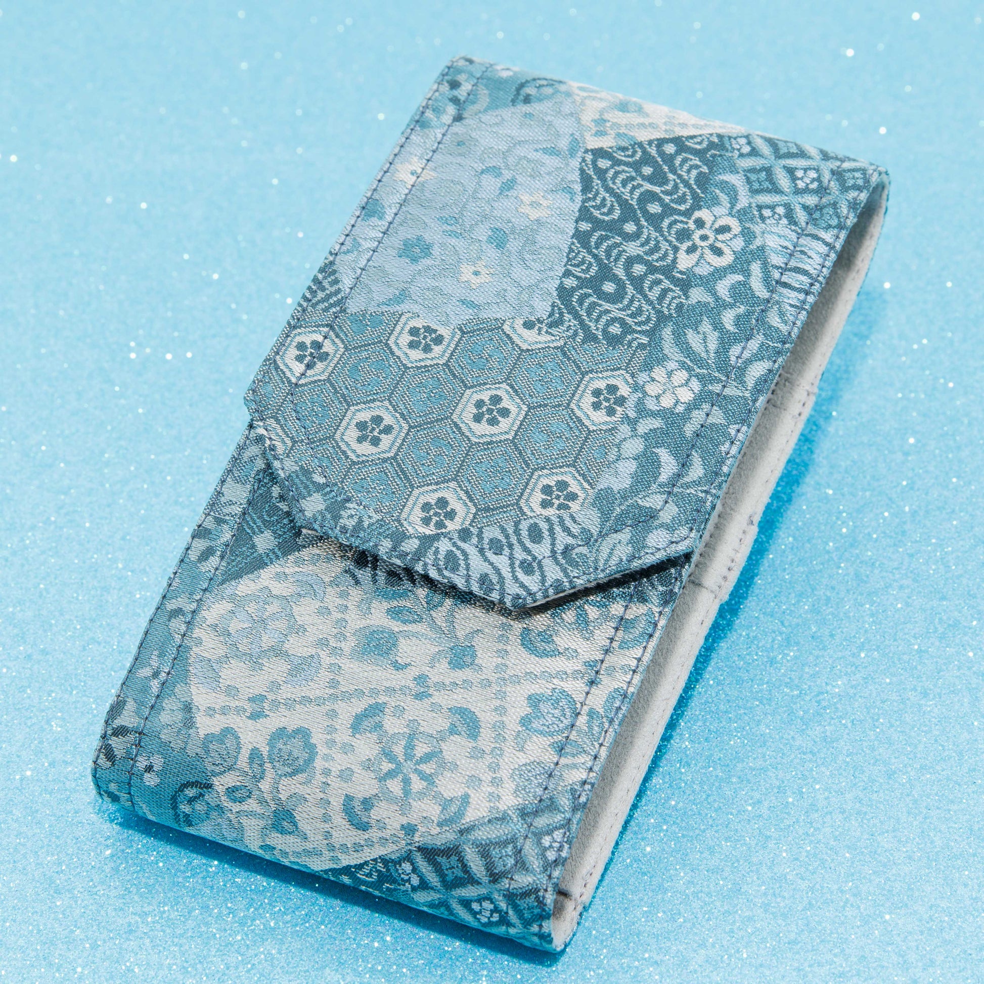 It features Nishijin-ori silk fabric, used in Japanese kimonos, meticulously crafted by Kyoto's long-established Konkan Shoten.