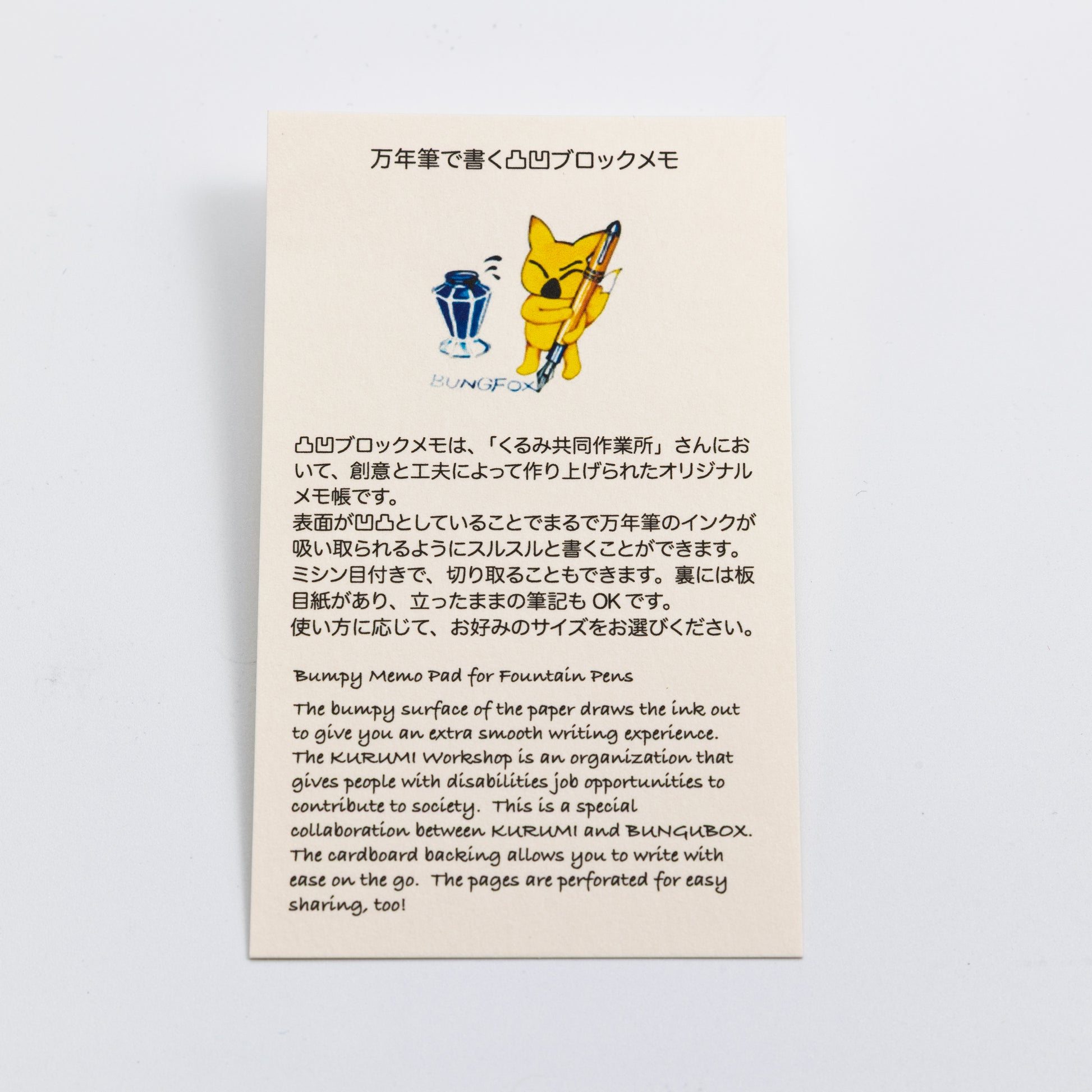 The KURUMI Workshop is an organization that gives people with disabilities job opportunities to contribute to society. This is a special collaboration between KURUMI and BUNGUBOX. The cardboard backing allows you to write with ease on the go. The pages are perforated for easy sharing too!